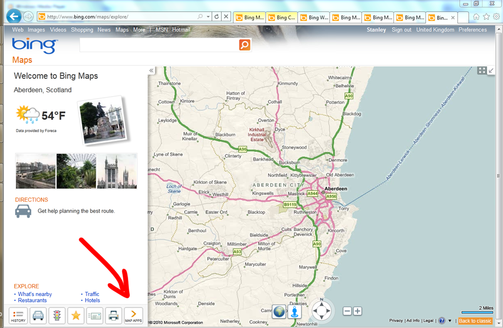 Easy – just press the button on the menu – shown in the screenshot below. There are lots of Map Apps – hover over each one to get a short description, and try them out (note: some of them are US-centric, so don’t be surprised if you can’t find cheap fuel prices in the UK)! Try out the Silverlight version of Bing Maps here…