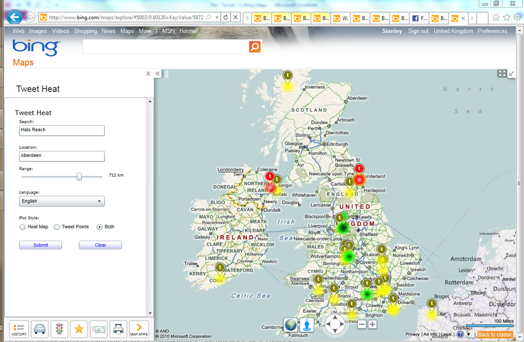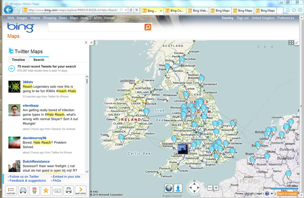 As an example – the screenshot below shows people who have recently tweeted about Halo: Reach within the UK (well – and some strange foreign-types at the lower-right of the map).